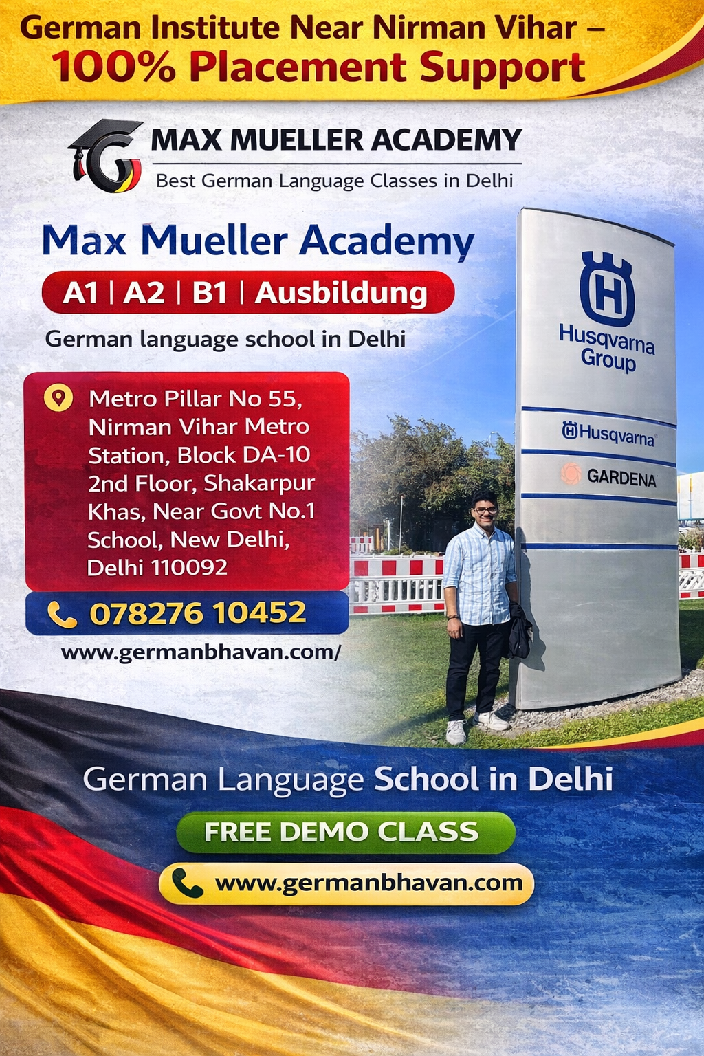 ( German institute near Nirman Vihar | German classes Nirman Vihar | best German institute Delhi | German coaching near me | A1 A2 B1 German classes Delhi | German language institute Nirman Vihar | learn German for Ausbildung | German course with placement | German Bhavan Nirman Vihar )