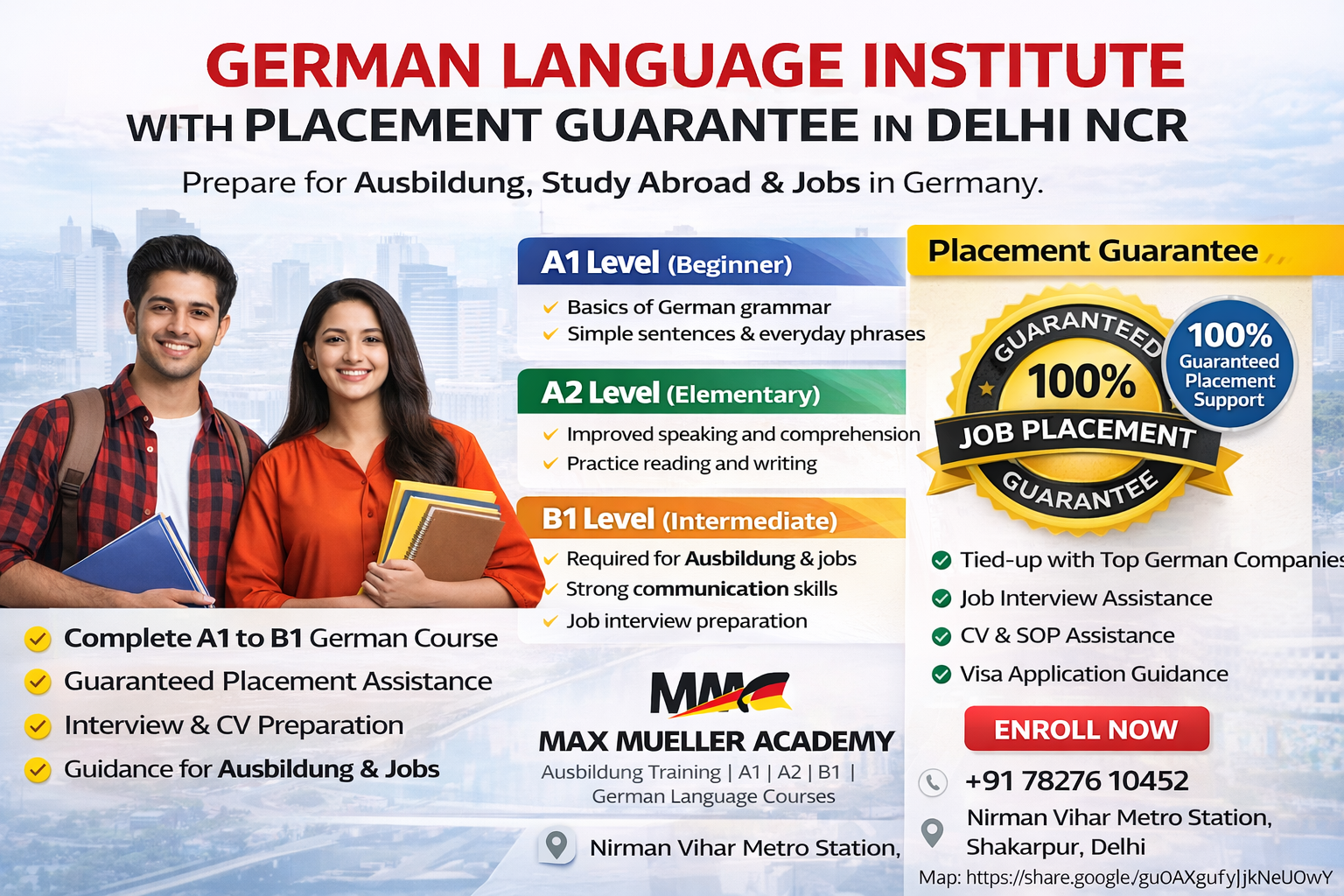 Max Mueller Academy in Delhi NCR offers a complete German language program from A1 to B1 along with strong placement support for students planning their future in Germany.